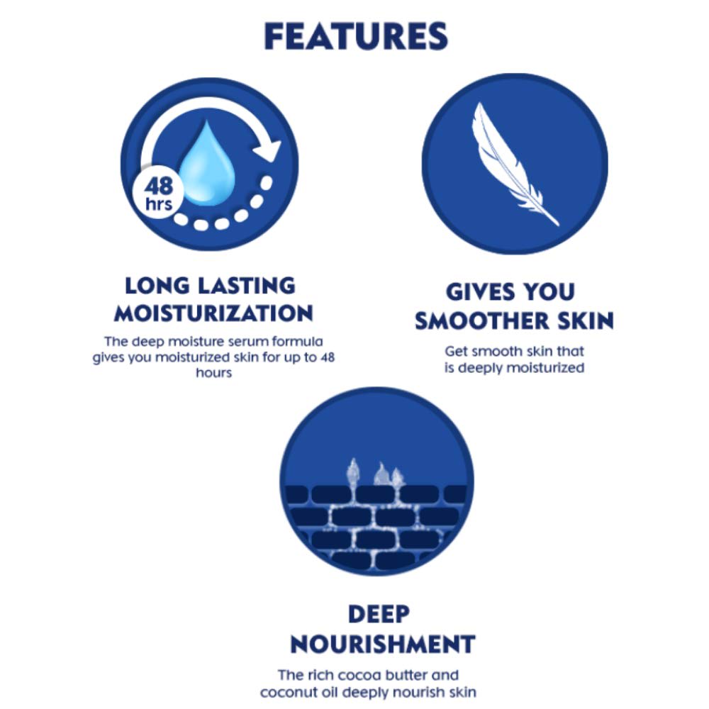 Smoothen away dry skin with the new Nivea oil in lotion cocoa nourish. A formula with the goodness of cocoa butter and coconut oil, it provides deep nourishment to your skin while keeping it smooth all day long. Its unique formula with deep moisture serum also gets absorbed quickly into the skin and provides moisturization for up to 48 hours.