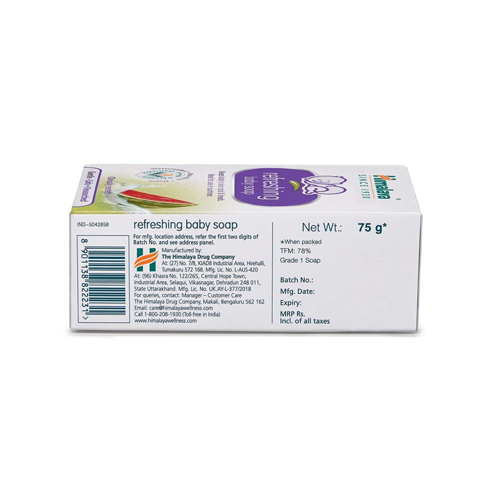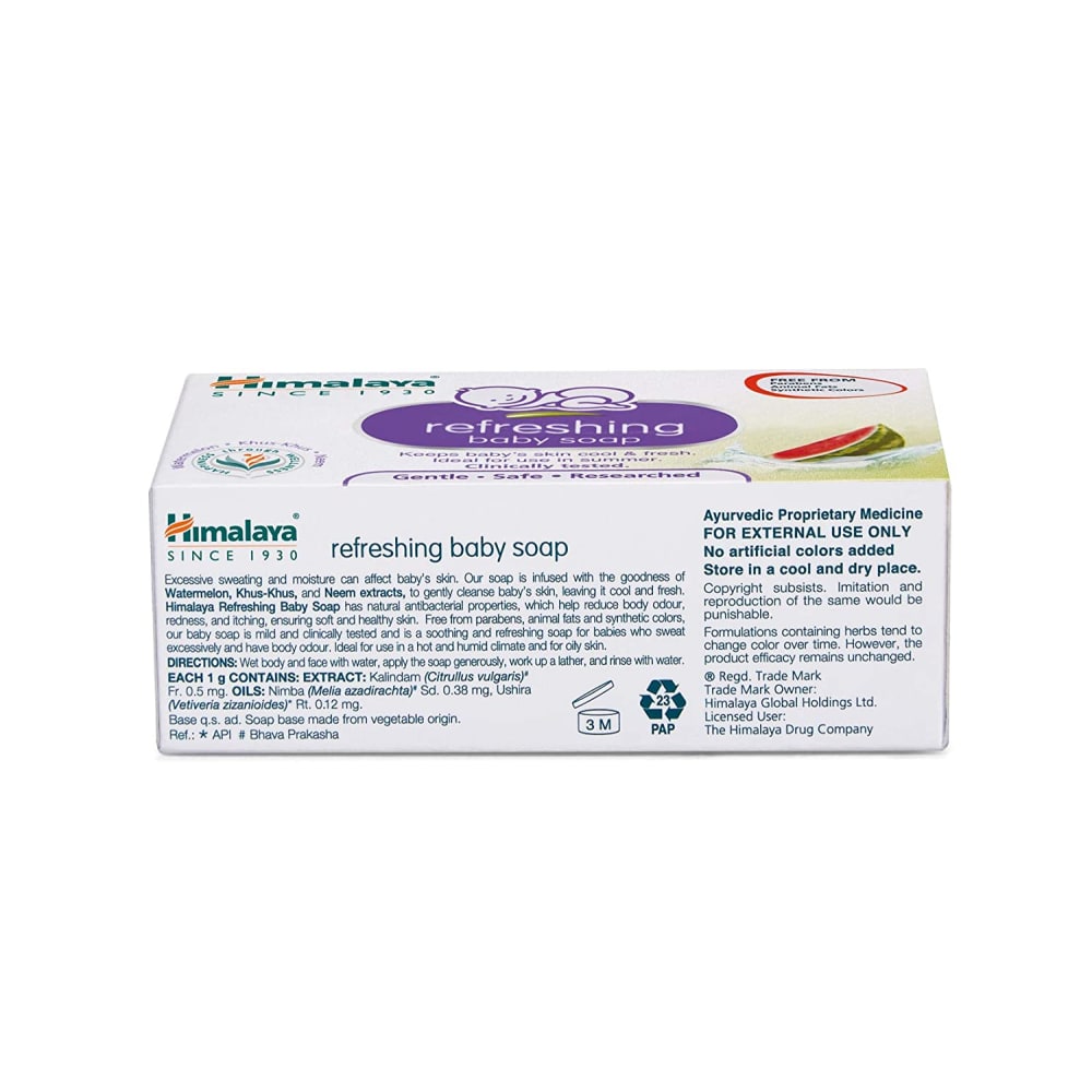 Himalaya's Refreshing Baby Soap has cooling, refreshing, antibacterial and anti-inflammatory properties, effectively helping to manage prickly heat in babies. It contains Watermelon that cools, Khus-khus to soothe and refresh the skin while Neem’s antibacterial properties prevent skin ailments. Ideal for use during the summer, Refreshing Baby Soap is free from artificial colours. Key ingredients: Watermelon keeps baby's skin cool and fresh. Khus Grass has antiperspirant and astringent properties, which keep baby dry throughout the day. Neem, a revered herb in Ayurveda, has antibacterial and anti-inflammatory properties and is beneficial for treating skin infections. Directions for use: Wet baby's face and body. Apply Refreshing Baby Soap generously, gently working up a lather, Rinse thoroughly. Pack size: 75 g & 125 g