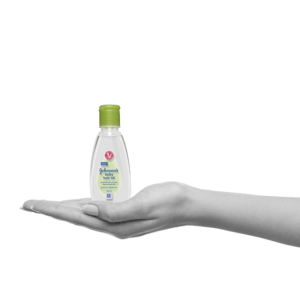That's why JOHNSON'S baby hair oil is light, non-sticky, and enriched with avocado and Pro-Vitamin B5 to keep your baby's hair soft and healthy.
