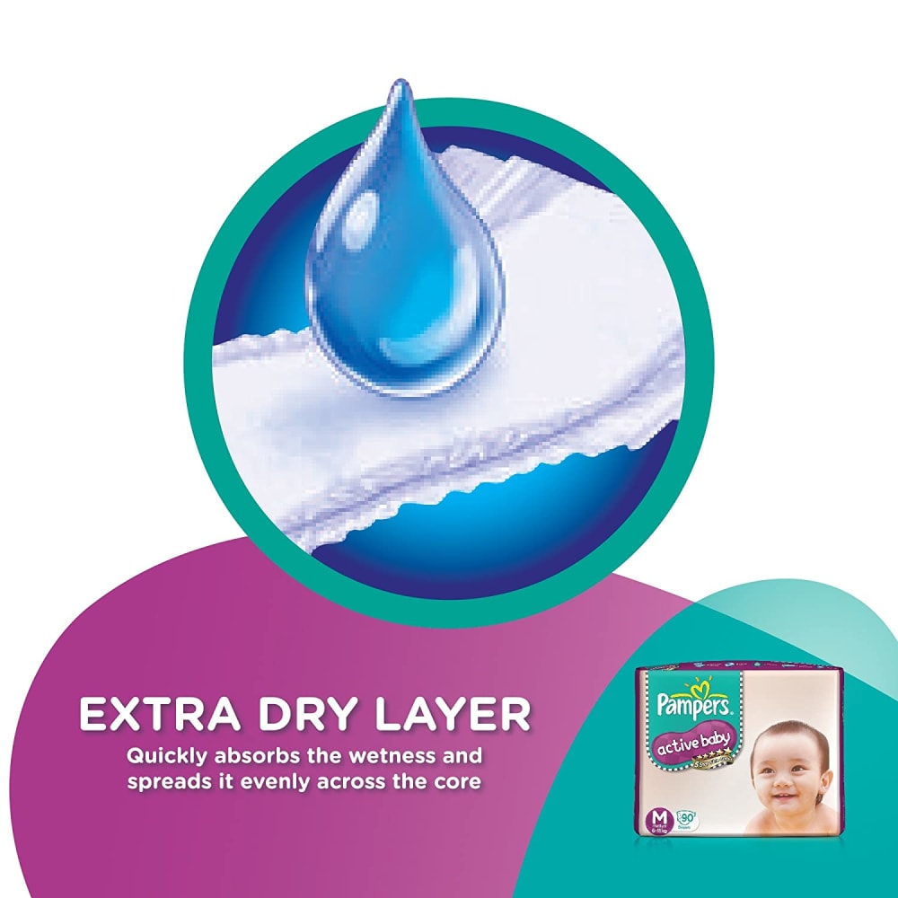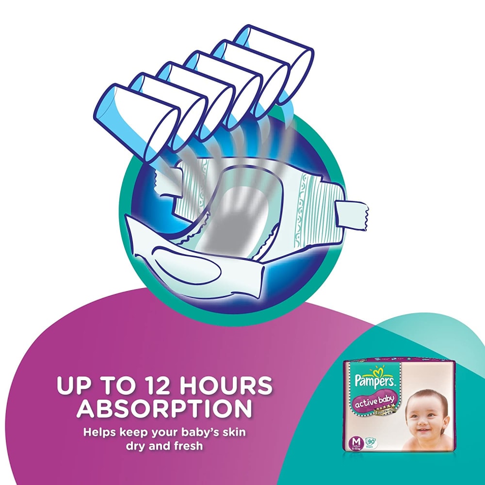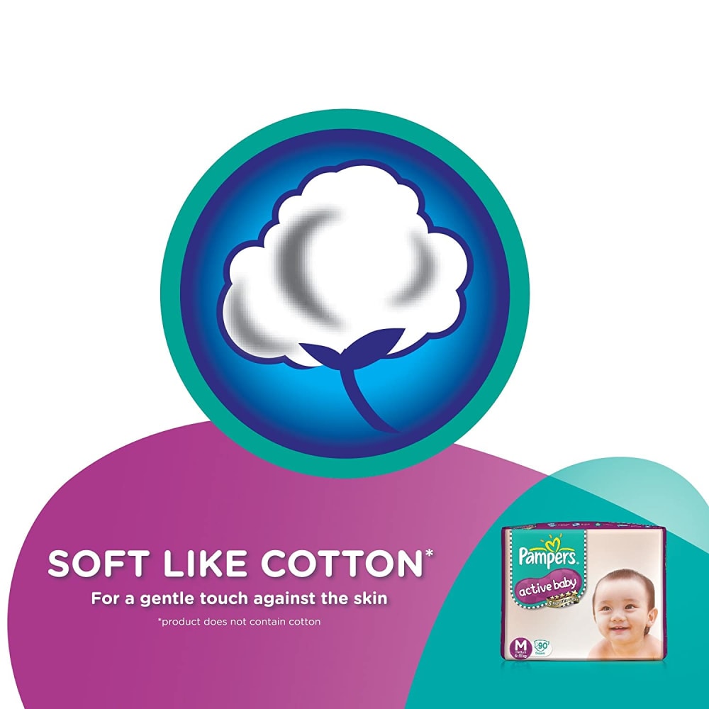 Outer layer of cotton like softness, this baby diaper provides intense care to your baby's sensitive skin and protects it effectively from friction rash and redness. These soft and comfort fitting diapers with stretchable sides are best for your baby's rest and playtime. The diaper's fastening tape sticks multiple times thus ensuring it stays in place even after you fasten it after checking your baby's diaper. Protection and nourishment of your baby's skin are taken care of with extracts of moisturising aloe vera lotion, characteristic of these best baby diapers. These diapers are ultra thin, thanks to the absorbent gel material AGM, commonly known as magic gel. This magic gel core of Pampers diapers is highly effective in absorbing frequent wetness. Naturally your baby's skin remains dry for upto 12 hours, now no more frequent diaper changing or blow leaks for your little angel.